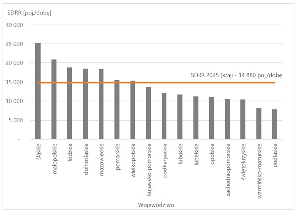 Wielkość ruchu jest zróżnicowana w poszczególnych województwach. Największy średni dobowy ruch na drogach krajowych, przekraczający 25 tys. poj./dobę, zarejestrowaliśmy w woj. śląskim. Z kolei najmniej obciążone ruchem były drogi w woj. podlaskim, gdzie SDRR był prawie o połowę mniejszy od średniej dla całego kraju i wyniósł 7865 poj./dobę.