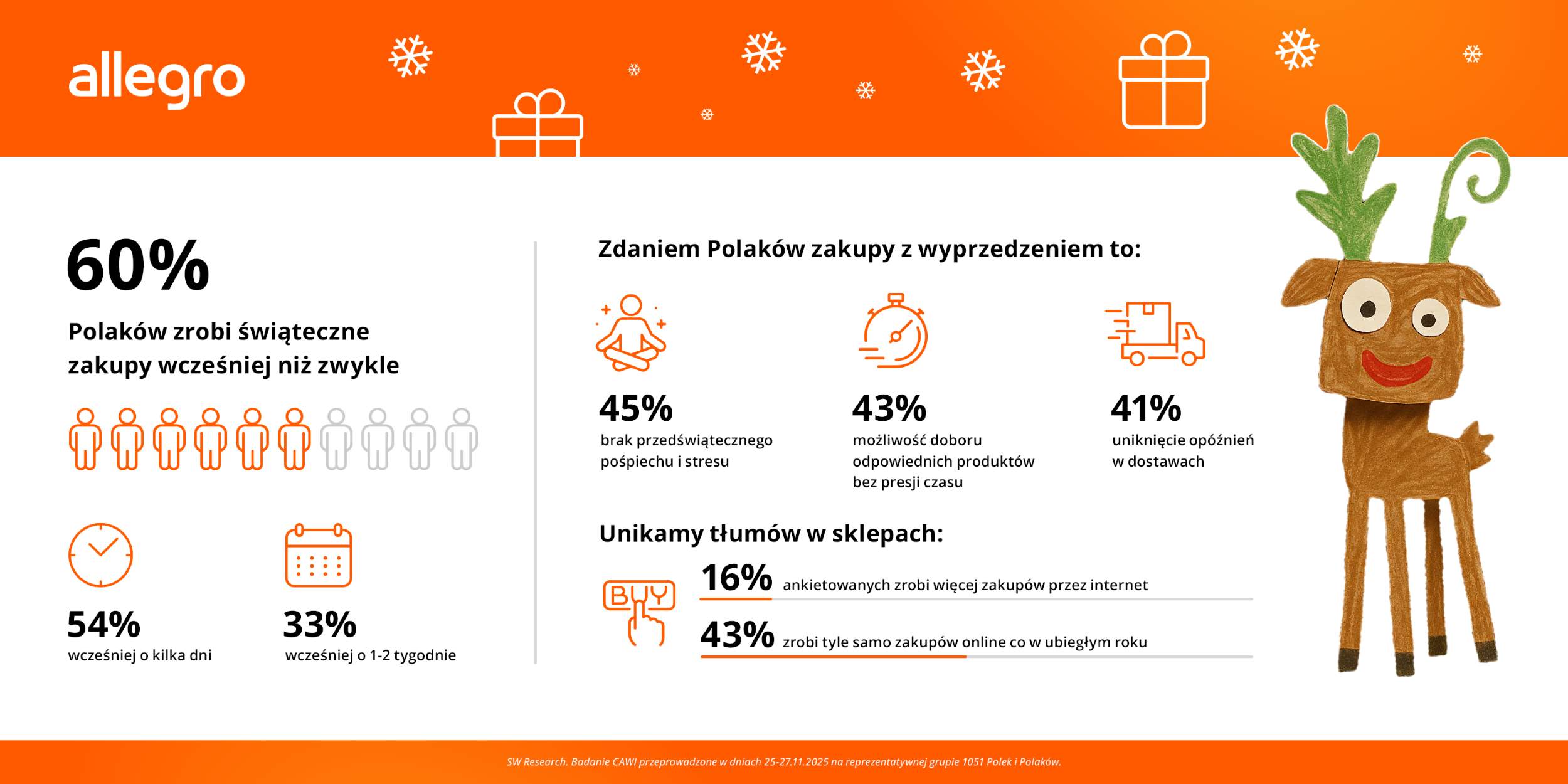 Respondenci wskazują, że największymi zaletami wcześniejszych zakupów są brak przedświątecznego pośpiechu i stresu (45%), możliwość spokojnego wyboru produktów (43%) oraz ograniczenie ryzyka opóźnień w dostawach (41%). Co więcej, niemal 1 na 5 osób zamierza kupić więcej niż przed rokiem w sieci. Jeśli wybiorą Allegro, nie muszą się martwić, czy prezenty pod choinkę dotrą na czas. W 2024 roku aż 99,85% przesyłek z oznaczeniem „dostawa przed świętami” dotarło zgodnie z tą zapowiedzią. Również w tym roku na platformie przy produktach pojawi się oznaczenie, pomagając w podjęciu zakupowych decyzji.