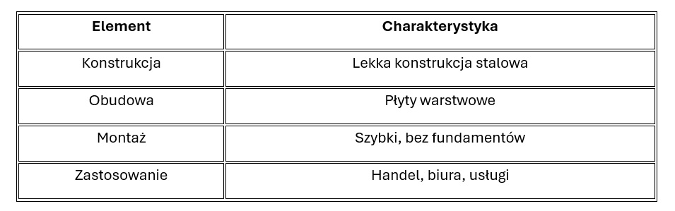 Produkcja opiera się na technologii lekkiej zabudowy, w której nośną konstrukcję stanowi stalowy szkielet, a ściany i dach wykonywane są z płyt warstwowych o rdzeniu styropianowym lub poliuretanowym. W większości przypadków obiekty nie wymagają wykonywania tradycyjnych fundamentów, co skraca czas realizacji inwestycji, ogranicza ingerencję w teren i umożliwia szybką relokację.