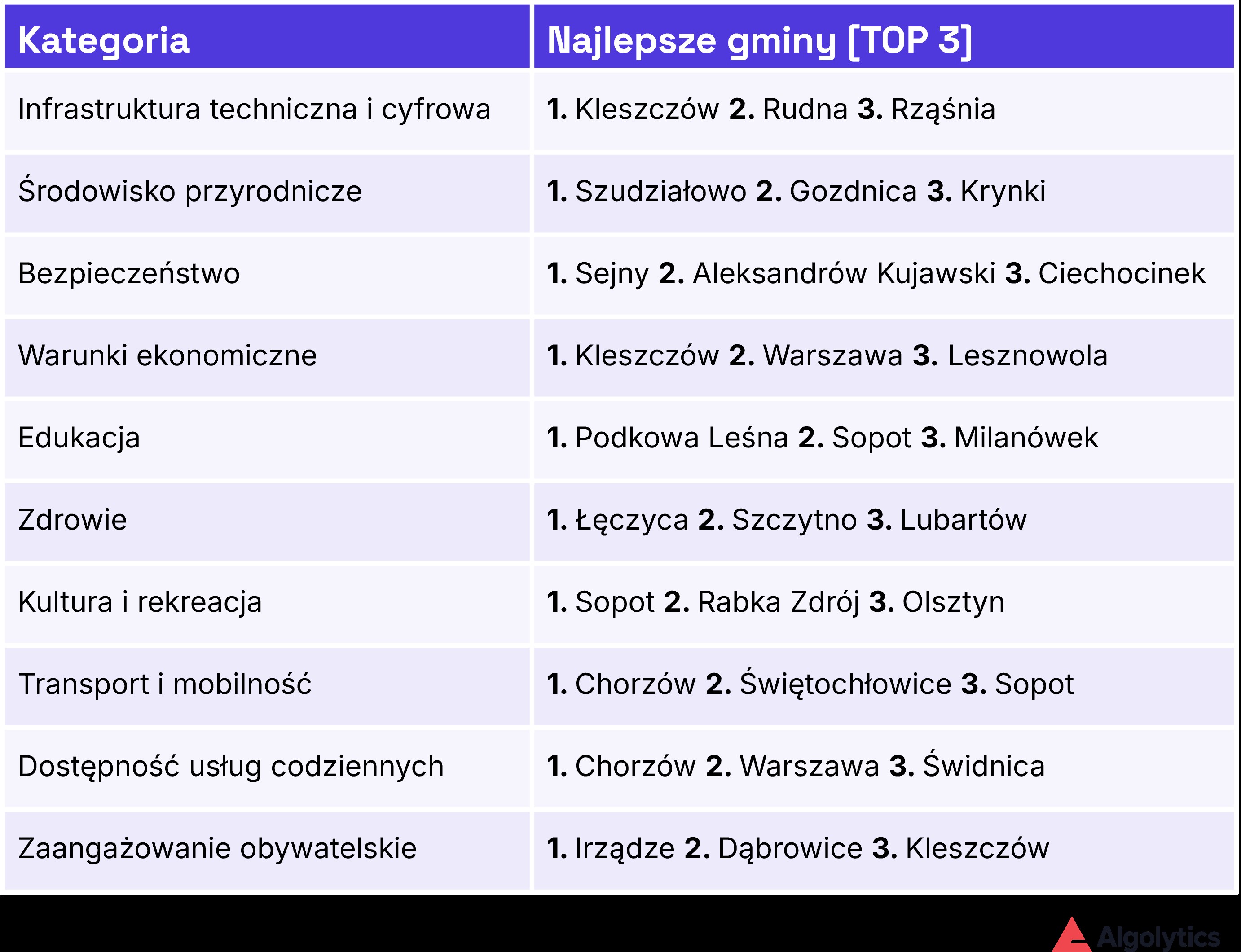 Pełny raport oraz szczegółowe wyniki wraz z wizualizacjami na mapie dostępne są pod adresem: https://algolytics.com/pl/raport-gdzie-zyje-sie-najlepiej-ocena-jakosci-zycia-w-gminach-i-przewodnik-po-location-intelligence/