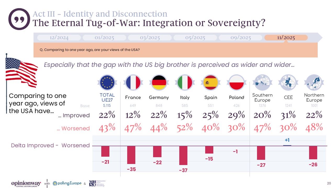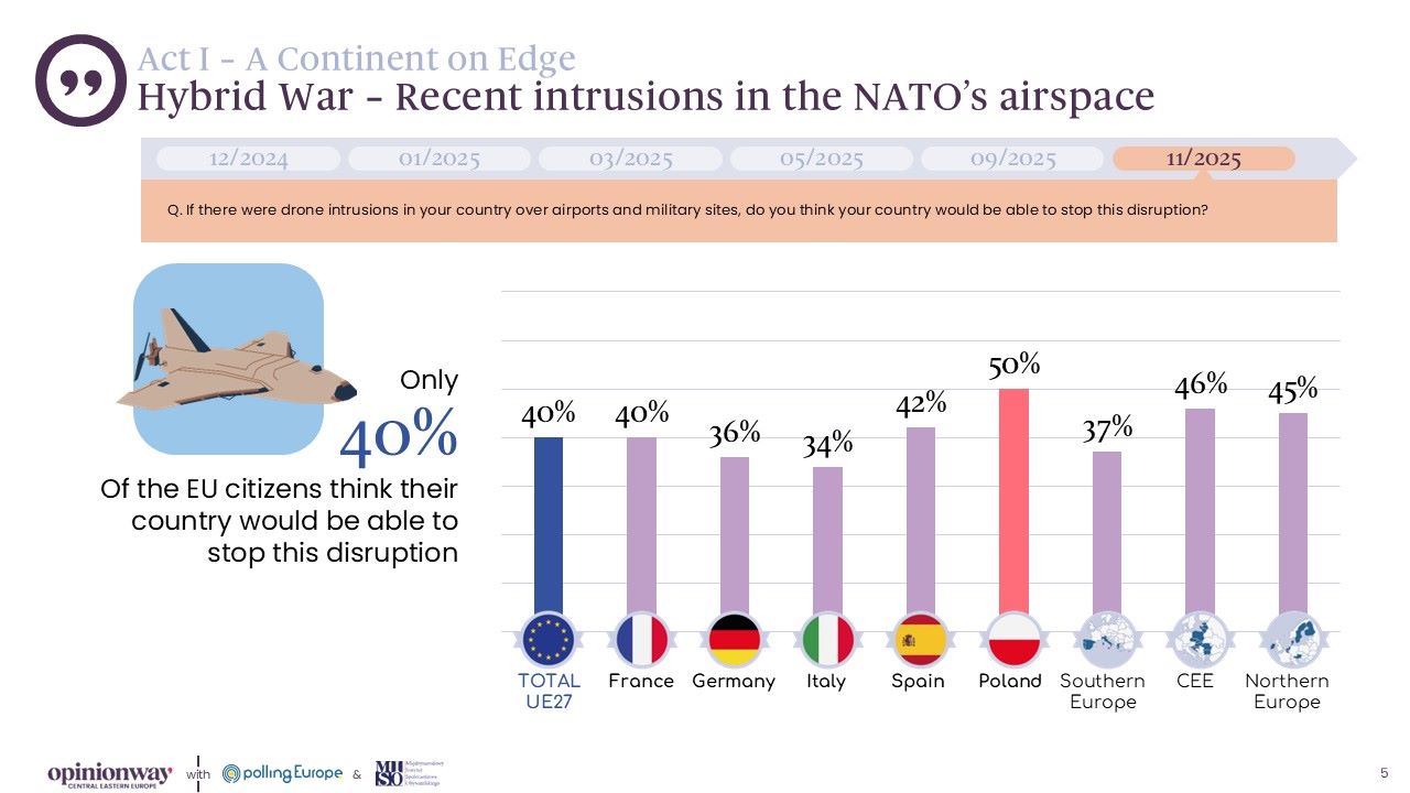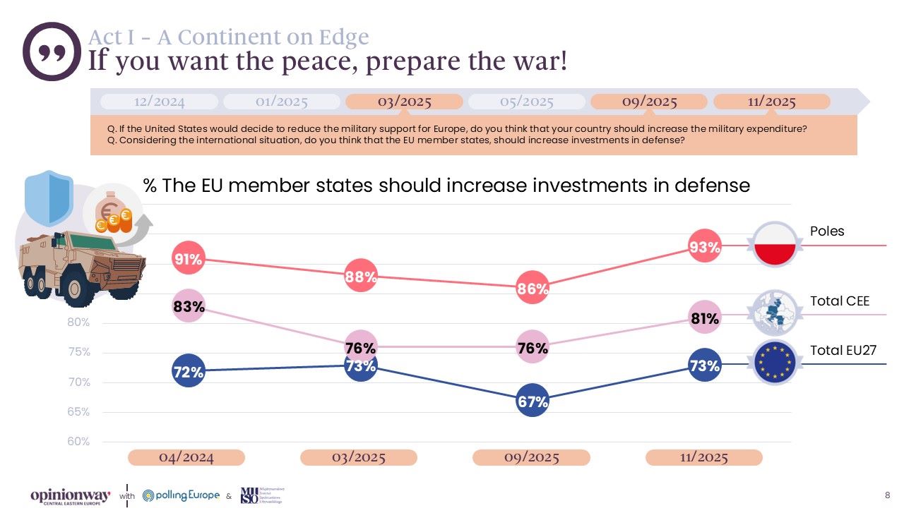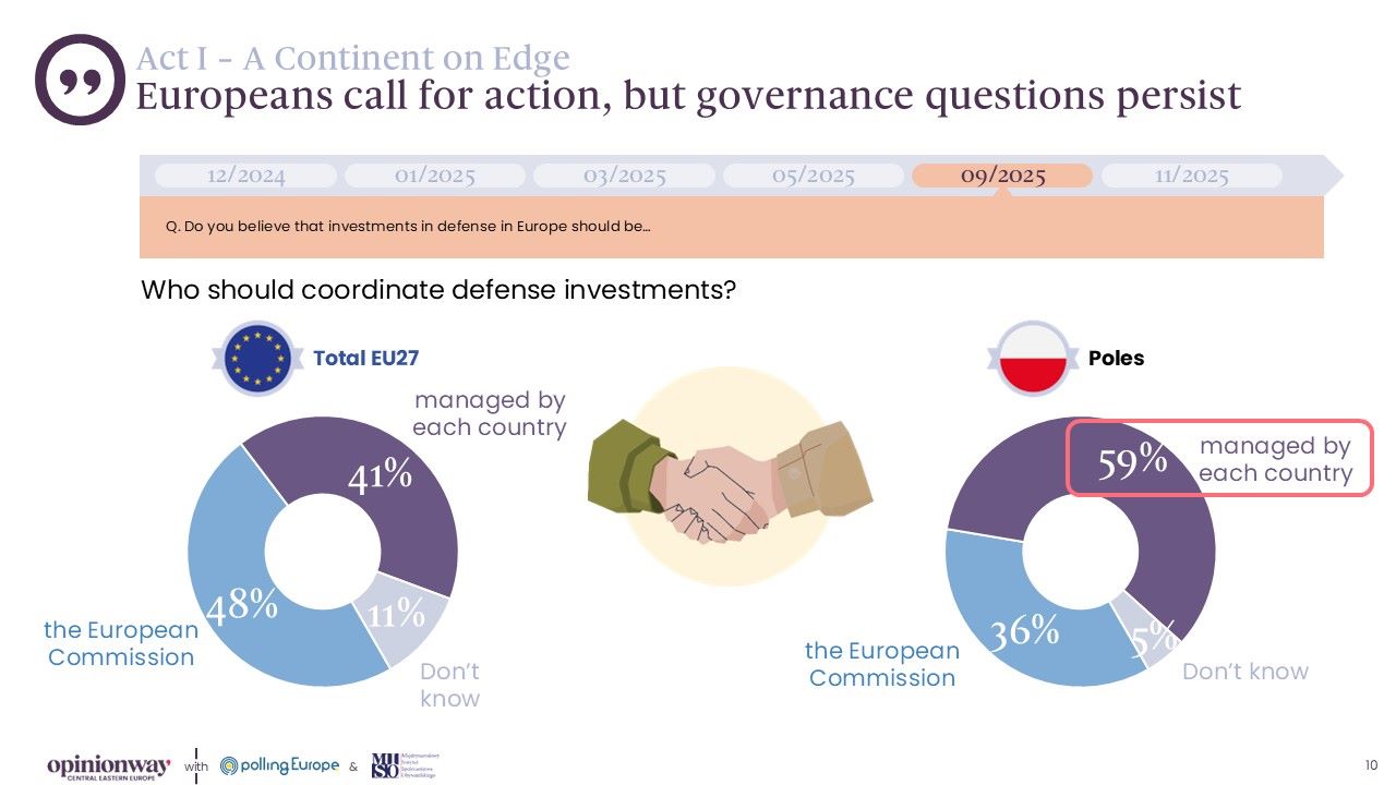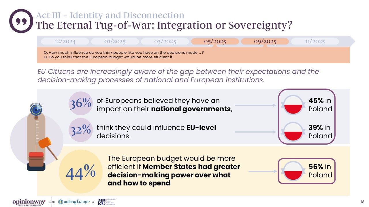 Polacy coraz bardziej ufają własnym możliwościom, przy jednocześnie ograniczonym zaufaniu do unijnych procedur. Połowa społeczeństwa uważa, że UE nie jest przygotowana na długotrwały konflikt. Polska staje się krajem jednocześnie coraz pewniejszym własnej sprawczości i coraz bardziej sceptycznym wobec instytucji unijnych, co kształtuje jej nową pozycję w europejskiej polityce.
