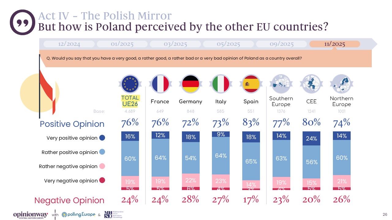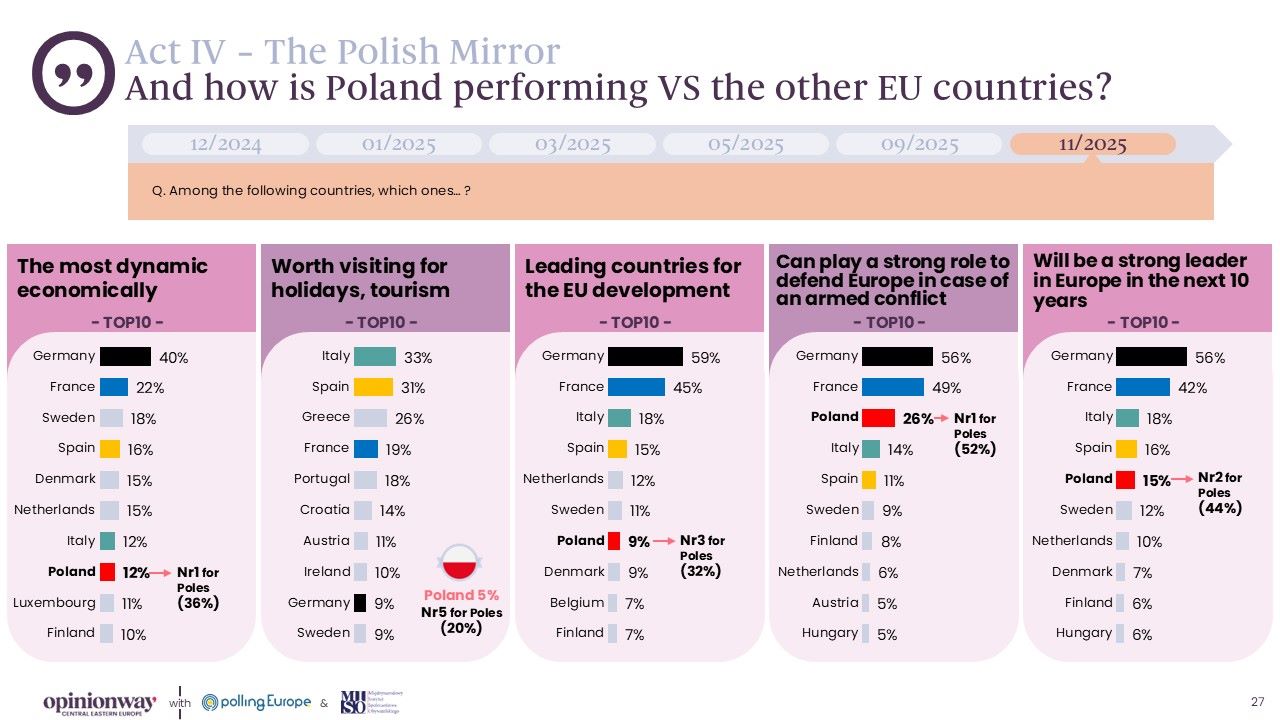 Obraz Polski w UE jest najlepszy od lat: 76% Europejczyków postrzega nas pozytywnie, a w Europie Środkowej i Południowej odsetek ten przekracza 80%. Polska jest oceniana jako dynamiczna gospodarka, a szczególnie ważny filar bezpieczeństwa kontynentu (3 pozycja w rankingu).