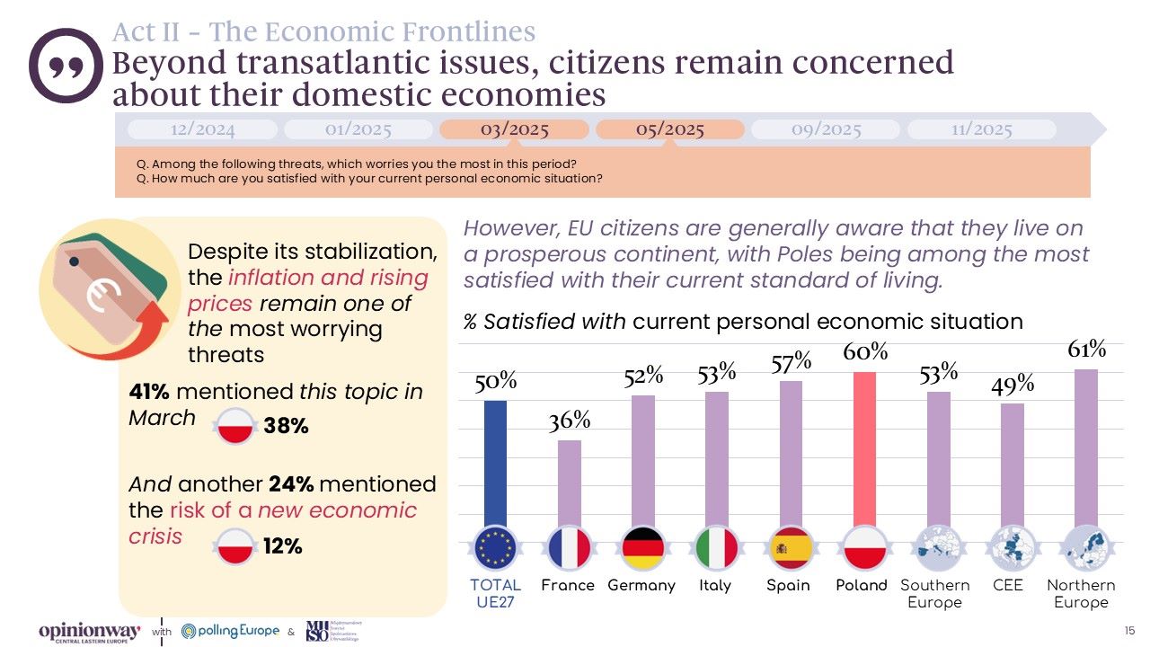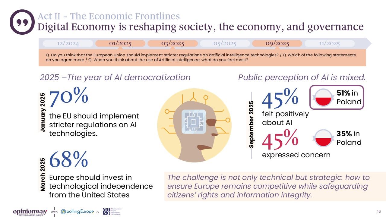 60% Polaków pozytywnie ocenia swoją sytuację materialną (UE: 50%). 51% respondentów ma pozytywne podejście do sztucznej inteligencji, przy jednoczesnym szerokim poparciu dla zaostrzenia regulacji i zwiększenia autonomii technologicznej Europy.