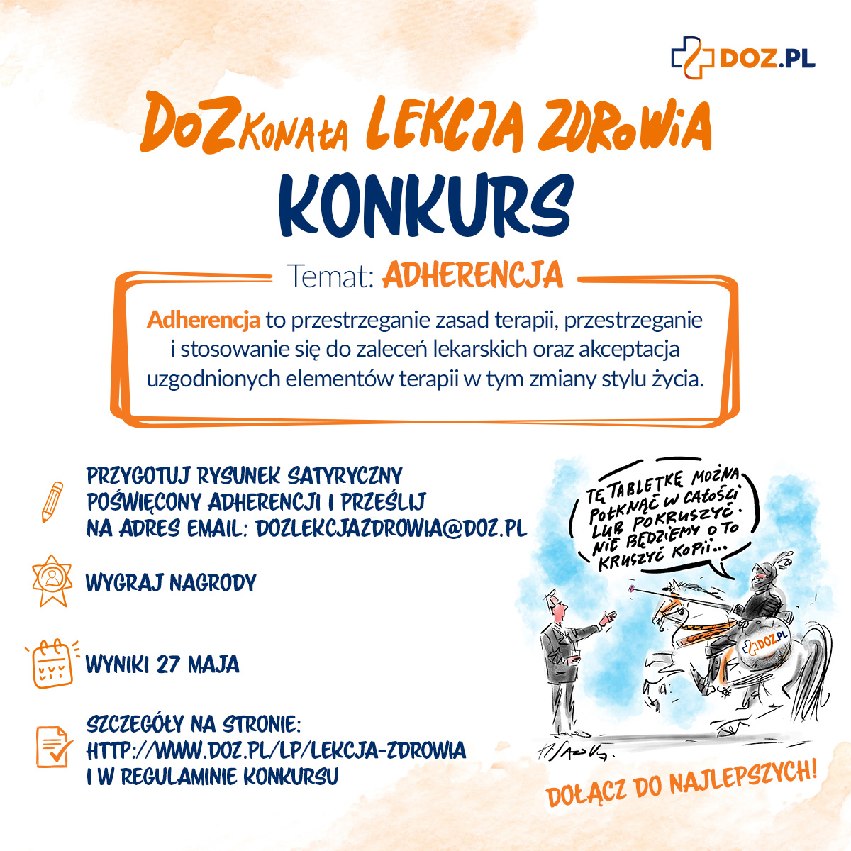 I właśnie z tej potrzeby zrodziła się kolejna inicjatywa kampanii DOZkonała Lekcja Zdrowia. Rusza konkurs na rysunek satyryczny o adherencji, skierowany do wszystkich osób w Polsce. Jego celem jest pokazanie w prosty, błyskotliwy i przystępny sposób, czym naprawdę jest przestrzeganie zaleceń terapeutycznych i dlaczego ma ono tak duże znaczenie dla zdrowia.