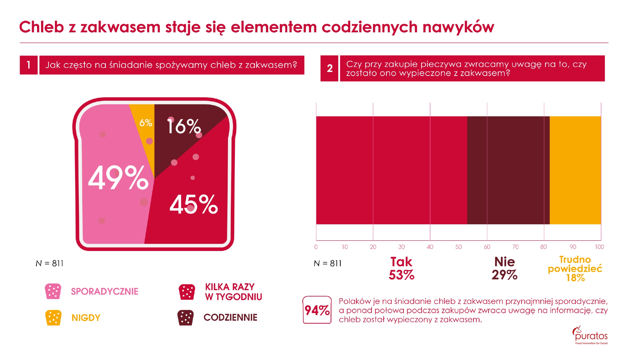 Ponad połowa Polaków deklaruje, że przy zakupie pieczywa zwraca uwagę na obecność zakwasu w składzie, a 94% przyznaje, że chleb na zakwasie pojawia się w ich domu przynajmniej od czasu do czasu. Blisko połowa spożywa go kilka razy w tygodniu.