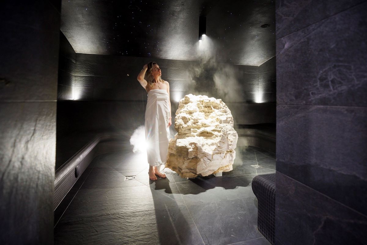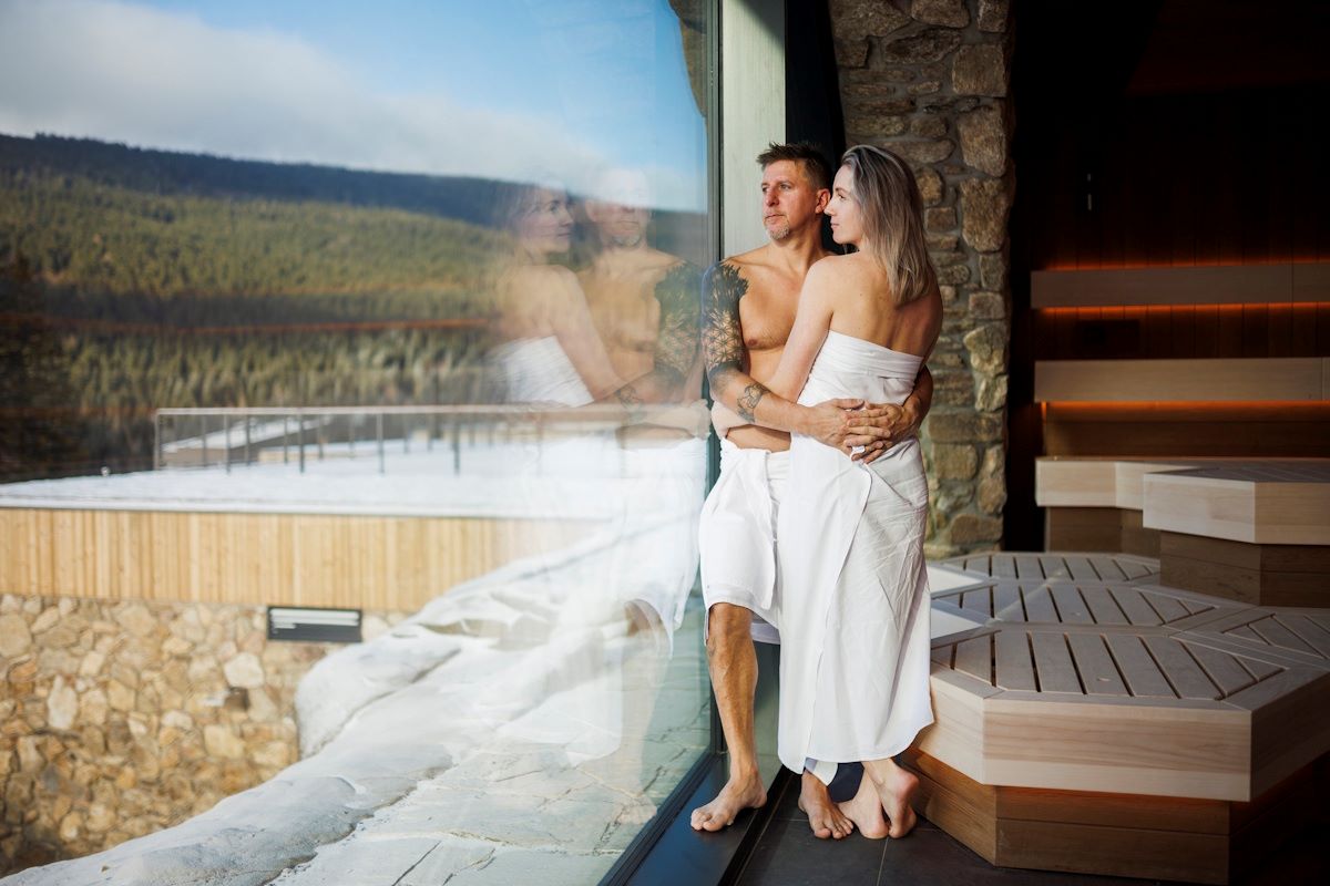 Świat saun, zaprojektowany w duchu górskiego krajobrazu Dolní Moravy, oferuje bogatą paletę doznań: saunę miodową, saunę ziołową, solną łaźnię parową, łaźnię parową z gwiaździstym niebem nad Dolní Moravą, strefy relaksu, prywatne strefy spa, zabiegi oraz masaże.