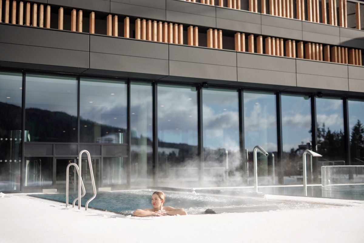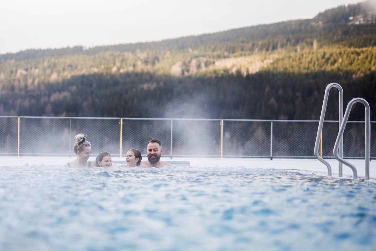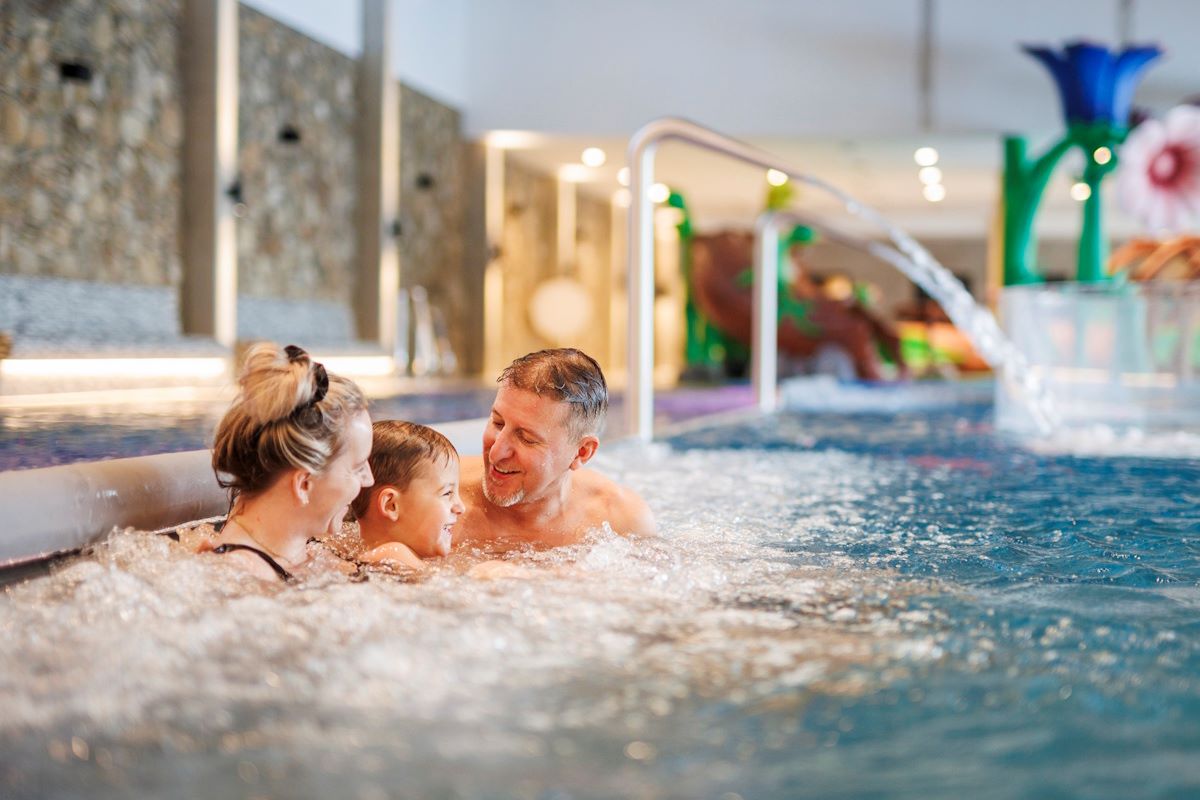 Świat basenów oferuje wewnętrzny basen relaksacyjny, tematyczny dziecięcy spray park inspirowany lokalnymi legendami o wróżkach, ziołami i mamutem, zjeżdżalnie, zewnętrzny podgrzewany basen wypływowy z widokiem na góry, letni basen dziecięcy oraz bistro z lekkimi przekąskami.