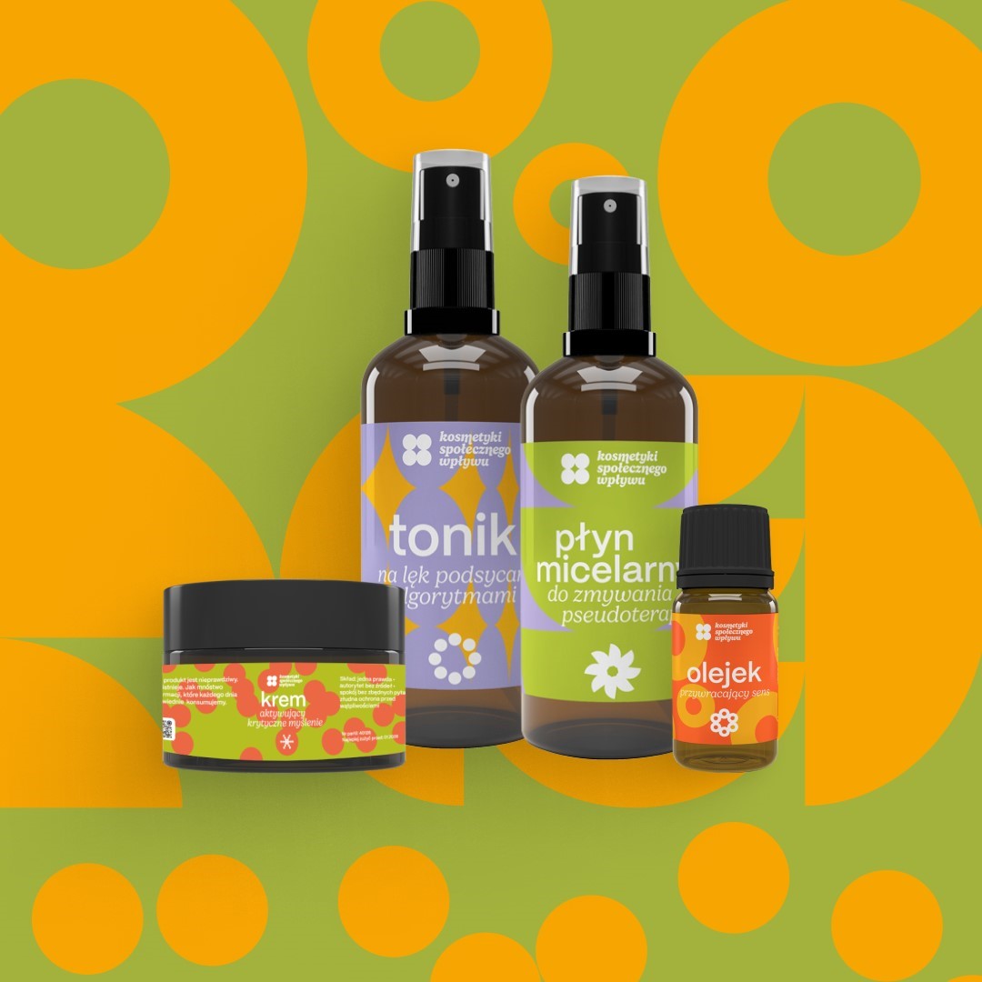 Nieszablonowym gadżetem kampanii są tytułowe Kosmetyki Społecznego Wpływu. To zestaw czterech produktów spośród których trzy są nieprawdziwe. Nie istnieją, podobnie jak wiele informacji, które każdego dnia bezrefleksyjnie konsumujemy w internecie. Jak podkreślają przedstawiciele Fundacji Wielogłosu, kosmetyki są niestandardowym narzędziem do zwrócenia uwagi na realny problem.