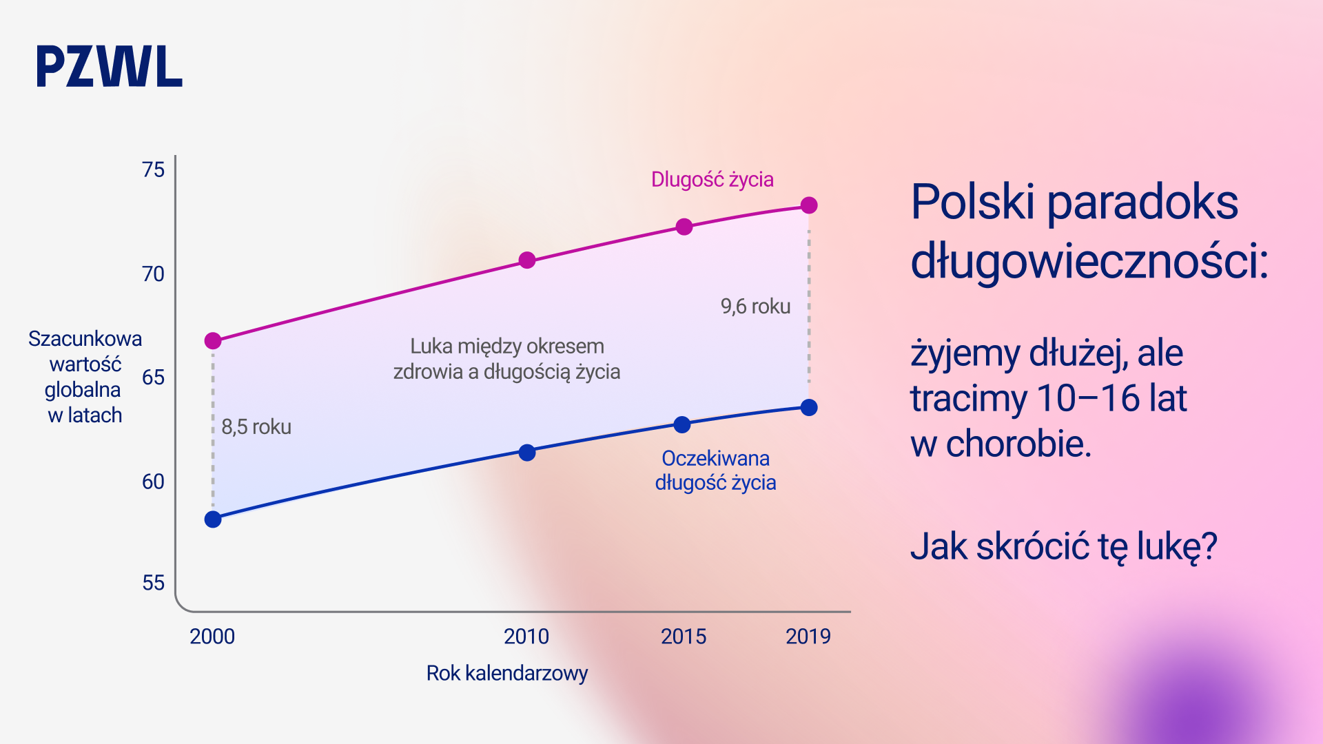 “Według danych Światowej Organizacji Zdrowia (World Health Organization, WHO) średnia długość życia w zdrowiu (healthspan), czyli liczba lat przeżytych bez choroby i poważnych ograniczeń, zatrzymuje się u nas na granicy 65 lat. To oznacza, że mężczyzna z Mazur czy ze Śląska spędza przeciętnie 10 ostatnich lat życia w cieniu nadciśnienia, cukrzycy albo niewydolności serca. A kobieta niemal 16.” [1]