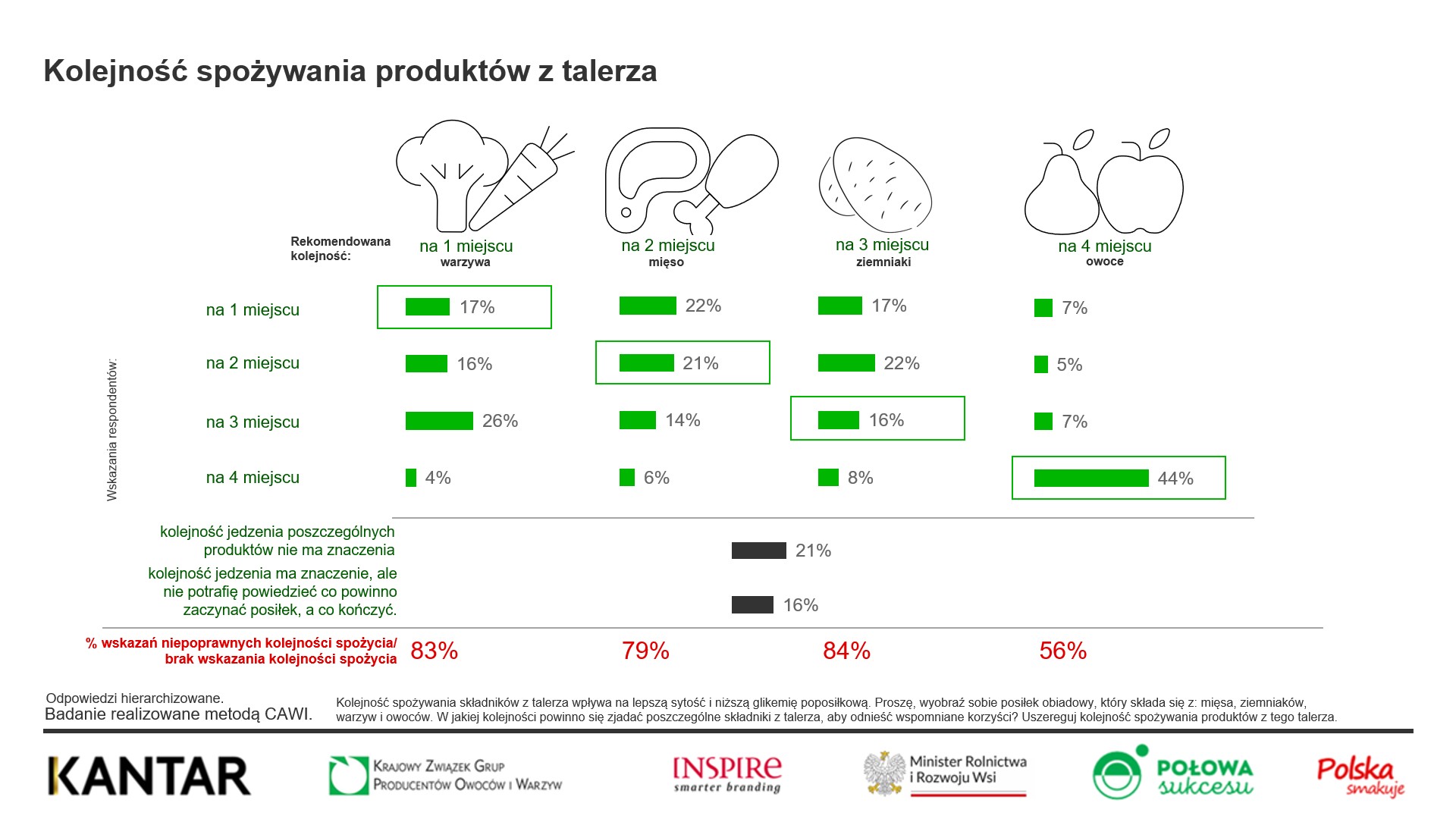 80% konsumentów nie potrafi uszeregować produktów w rekomendowanej kolejności ich prawidłowego spożywania. Na pierwszym miejscu warzywa uszeregowało poprawnie tylko 17% badanych. Na drugim miejscu mięso wskazało 21% badanych. Na trzecim miejscu ziemniaki zaznaczyło 16% badanych.
